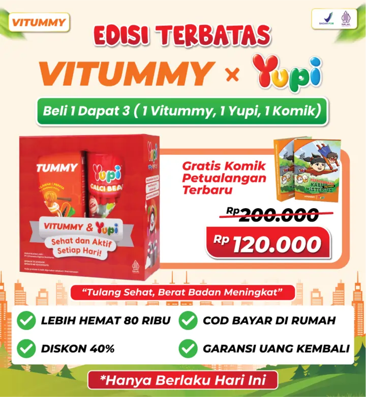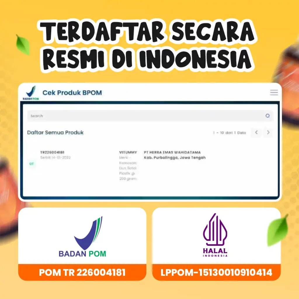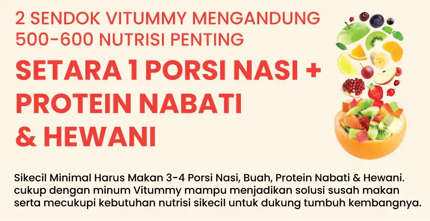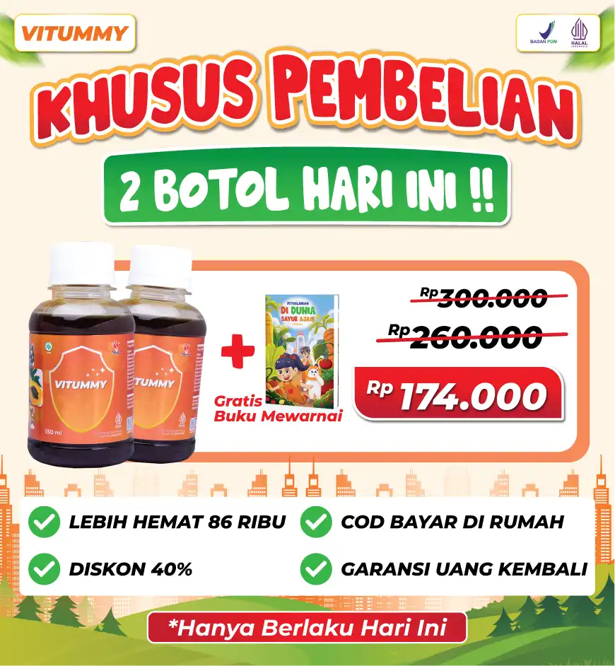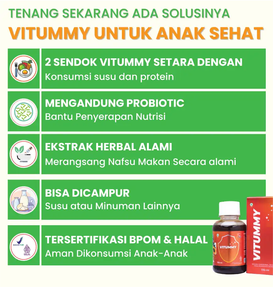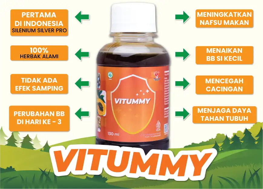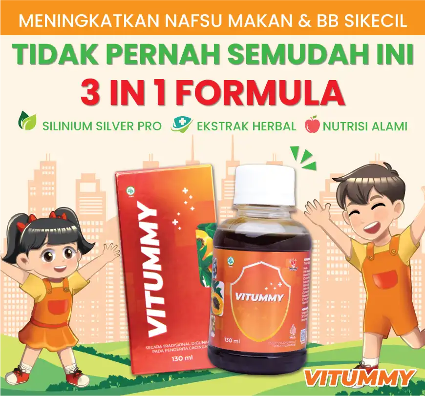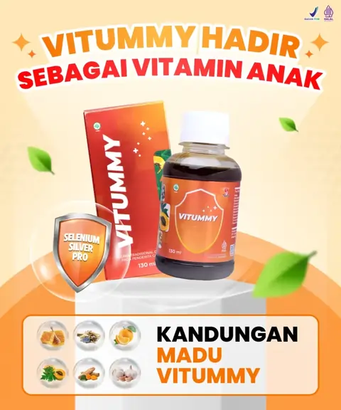 VITUMMY adalah madu herbal yang diformulasikan khusus dengan kandungan SELENIUM Silver Pro + PROBIOTIK MURNI efektif meningkatkan NAFSU MAKAN ANAK dan menaikkan BB 2-3Kg (bikin anak GEMUK), Meningkatkan Daya Tahan Tubuh (Biar Ngga Gampang Sakit)